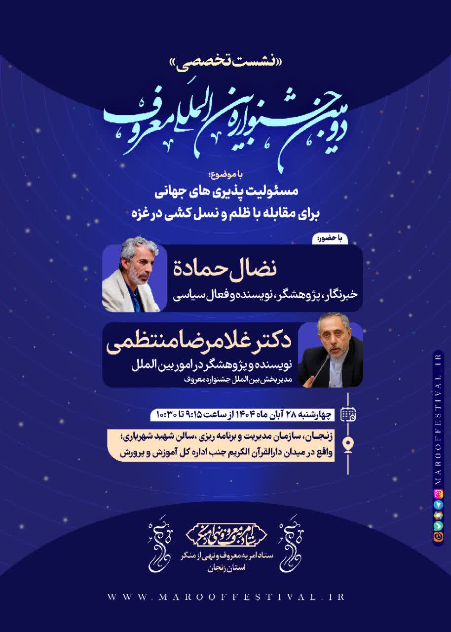 نشست تخصصی دومین جشنواره بینالمللی «معروف» با موضوع «مسئولیتپذیریهای جهانی در مقابله با ظلم و نسلکشی در غزه» در زنجان برگزار میشود.